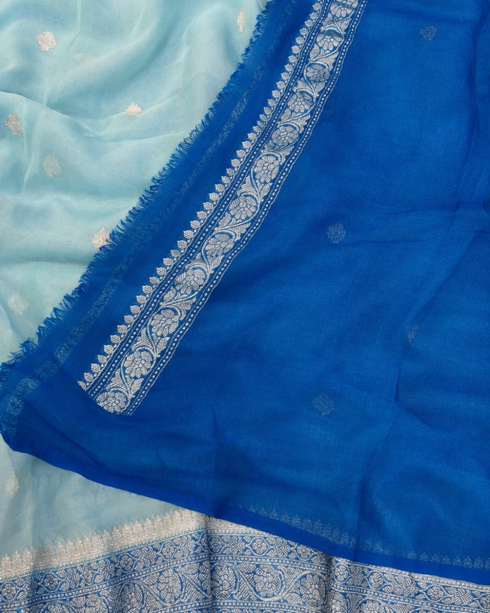 Drape yourself in the ultimate Benaras luxury, this handwoven Pure-Chiffon displays beautiful intricate silver zari work across the body and pallu to embellish the subtle beauty. You can’t help but fall in love with the work of art.